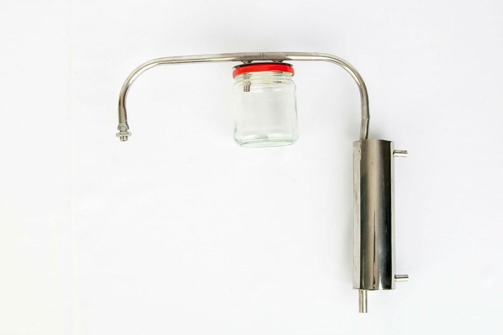 Сухопарник в виде стеклянной банки необходим для дополнительной очистки и ароматизации самогона - задерживает тяжелые примеси сивушных масел и спасает от брызгоуноса браги, все гадости можно сливать прямо во время перегона, просто сменив банку на другую. В конечном счете можно улучшить качество и чистоту получаемого самогона.